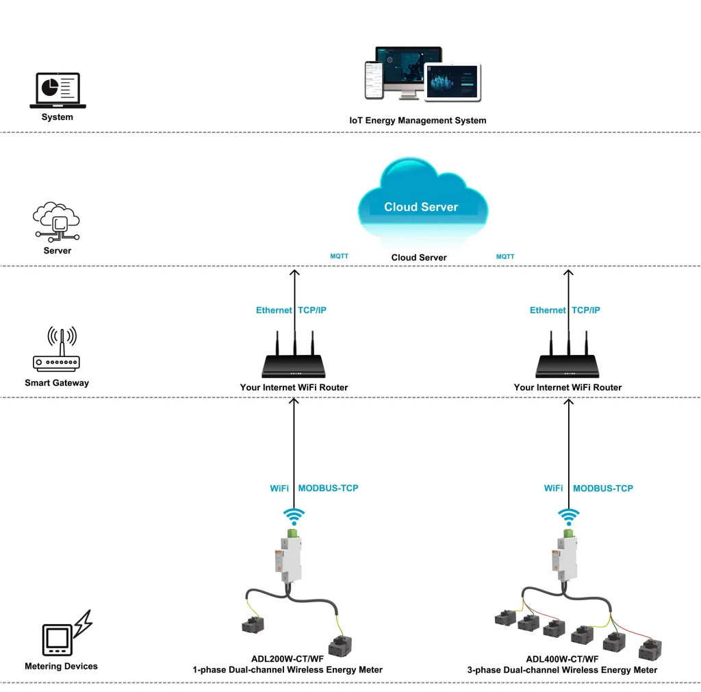 ADL200W ADL400W Series DIN-Rail Mounted Multifunctional and Dual Circuits Electric Energy Meter With External Current Transformer is an intelligent instrument mainly designed for new energy power generation systems such as photovoltaic grid-connected system, micro inverter system, energy storage system, AC coupling system, etc. The product has the advantages of high precision, small volume, high respondent speed and convenient installation.